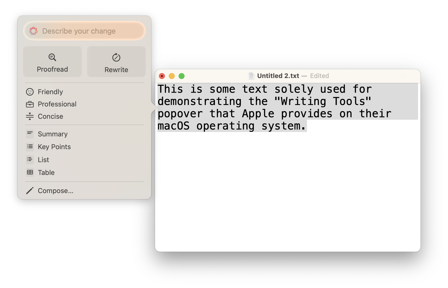 Here’s how this works: You select some text, and a small icon will appear next to the text. If you click on it, a small popover will appear that allows you to perform various operations on the text – from proofreading through reformulating, or changing the text. Some built-in apps such as Mail already use this under the hood to, e.g., summarize email chains.