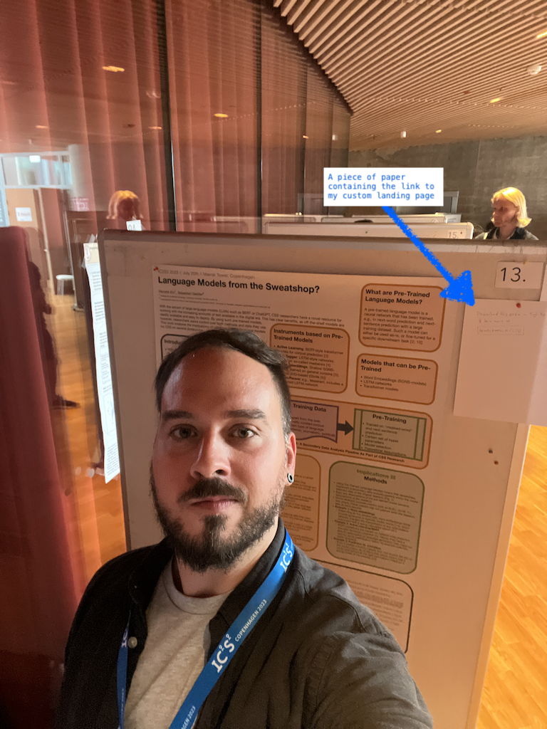 This year, I was at IC2S2 in Copenhagen, and I realized that I needed to give people further information if they were interested in my poster, such as articles that I have already written on the topic. They could’ve searched for that content on my website, but who does this? Right: no one. So I decided to collect all that information that might be of interest and added it to a custom landing page with an easily memorable link.