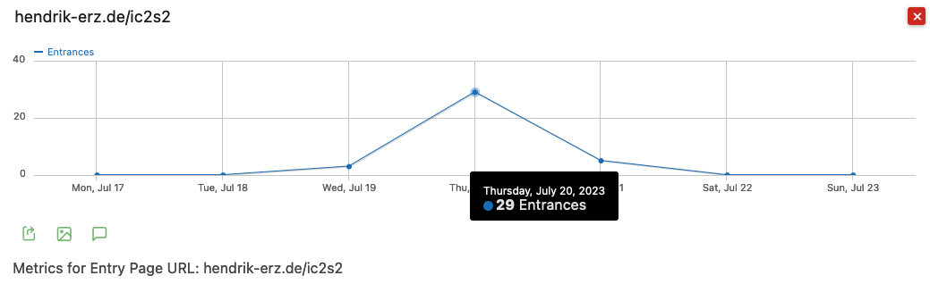 Since the link was reasonably easy to memorize, I could rest assured that some people would actually go there. This has immense benefits. First, I could contextualize my poster within the context that the readers of the website would all be at IC2S2. But, even better: by looking at the website analytics, I could see how many people have actually visited the link, giving me a rough estimate of how popular my poster was. Since I did not link the page anywhere else, every click must have come from a person standing in front of my poster. Have a look: With my analytics, I can see that 29 people have actually looked up information. July 20th was the day my poster was actually presented. The clicks the day before was just me seeing if everything worked as intended.